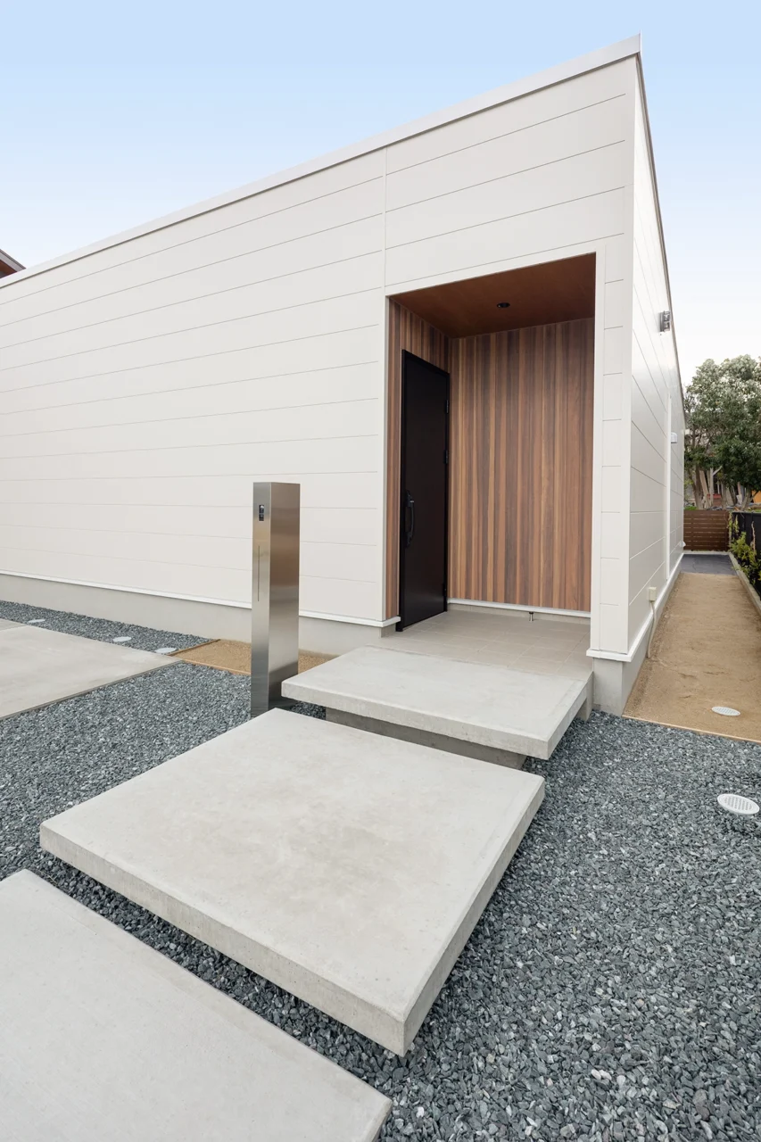 愛犬にやさしい床材を採用しながら、スタイリッシュな外観と木のぬくもりを感じる内観が美しいコントラストを生む一邸です。