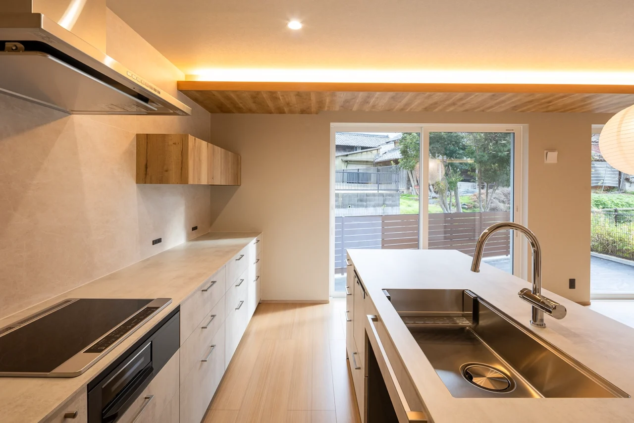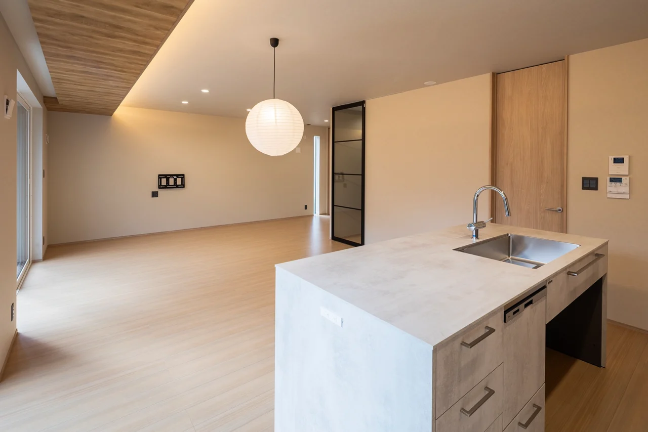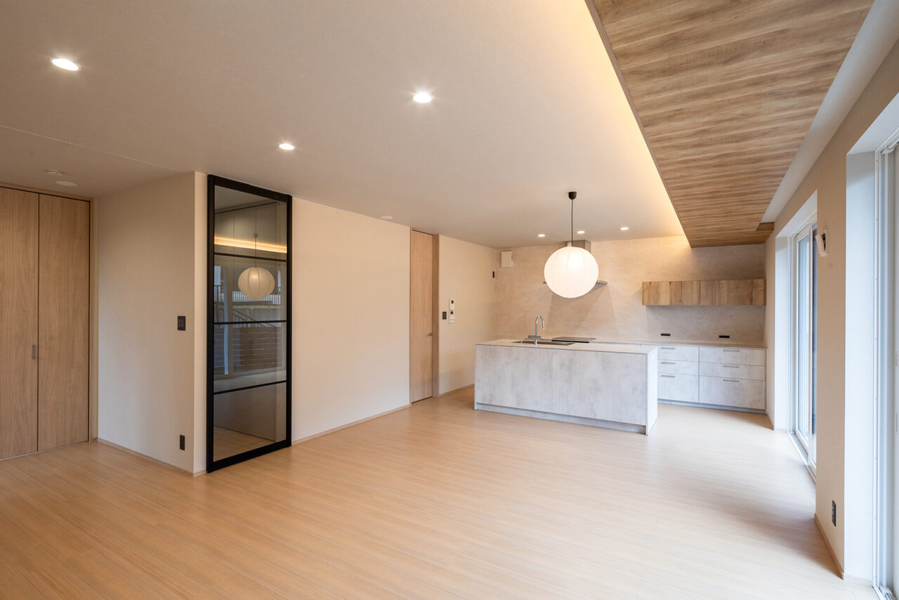 LDKの折り上げ天井が印象的で、空間に豊かな表情をもたらす平屋の住まい。
